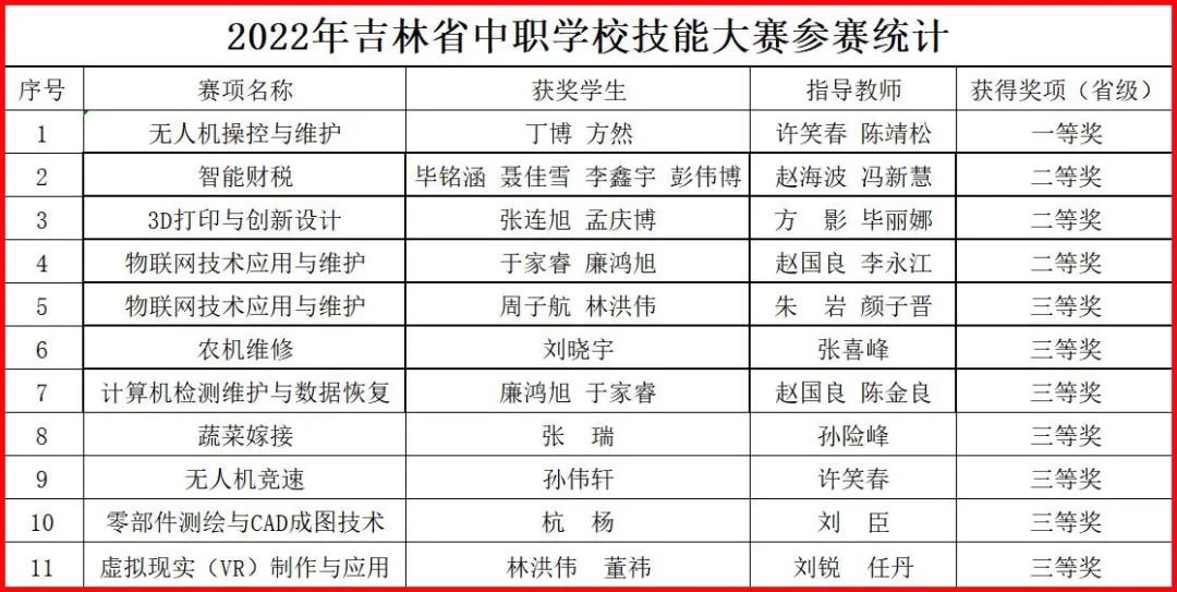 2022年吉林省中职院校技能大赛比赛已接近尾声。我校组织了17支参赛队伍参加了15个赛项角逐,目前已完成了11个赛项。获得一等奖1项,二等奖3项,三等奖9项。其中“无人机操控与维护”赛项,两次蝉联省赛一等奖,“智能财税”、“3D打印与创新设计”和“农机维修”赛项创造了历史最好成绩。